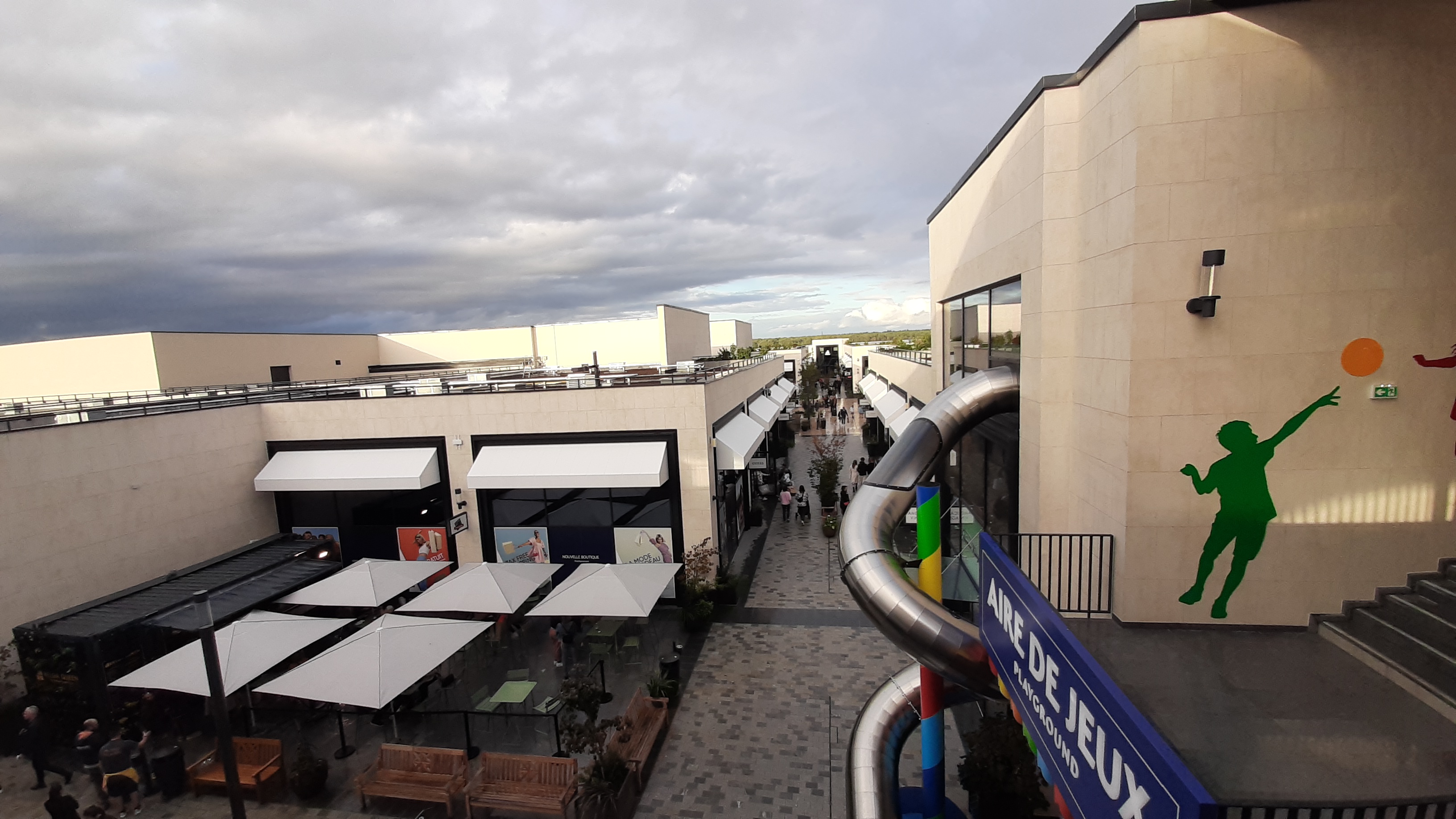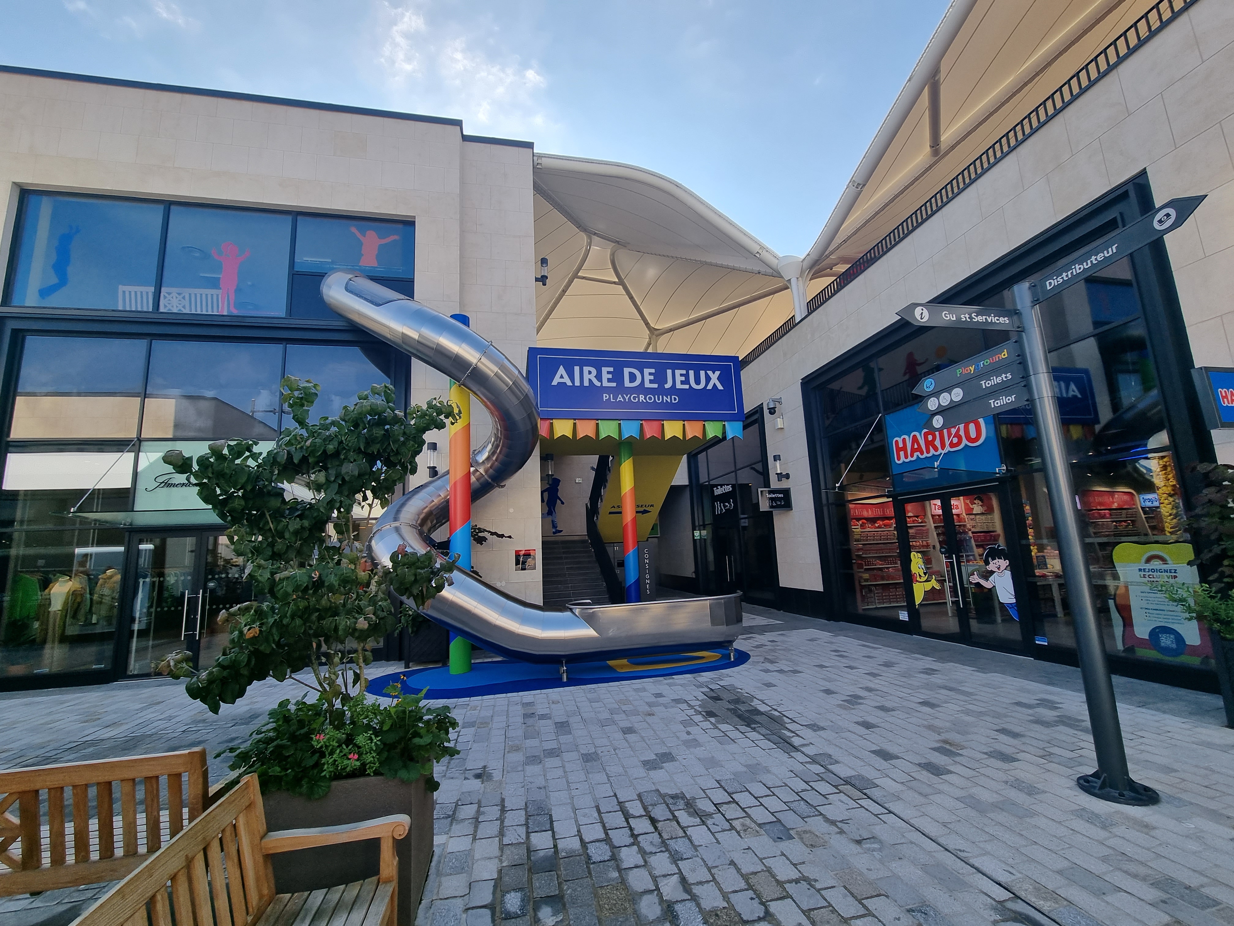 Bel endroit, sympa pour se balader. Les boutiques sont plutôt vers le haut de gamme. L’espace de jeux avec les structures pour petits est top et l’espace extérieur couvert pour les plus grands est super! Les enfants seront ravis entre deux boutiques ! Toilettes propres.